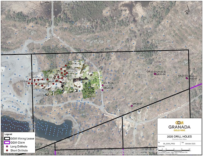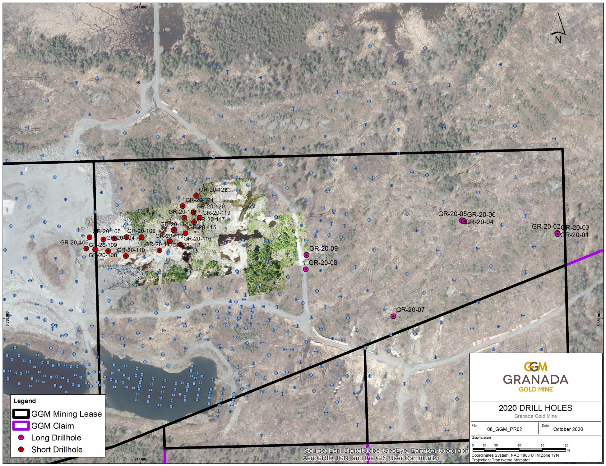 The 100-series holes were drilled to intersect the vein uncovered by stripping and to follow the high-grade corridor. Holes GR-20-118 to GR-20-125 are vertical holes drilled to intersect the mineralized vein structures and Hole GR-20-126 is drilled within the vein structure.