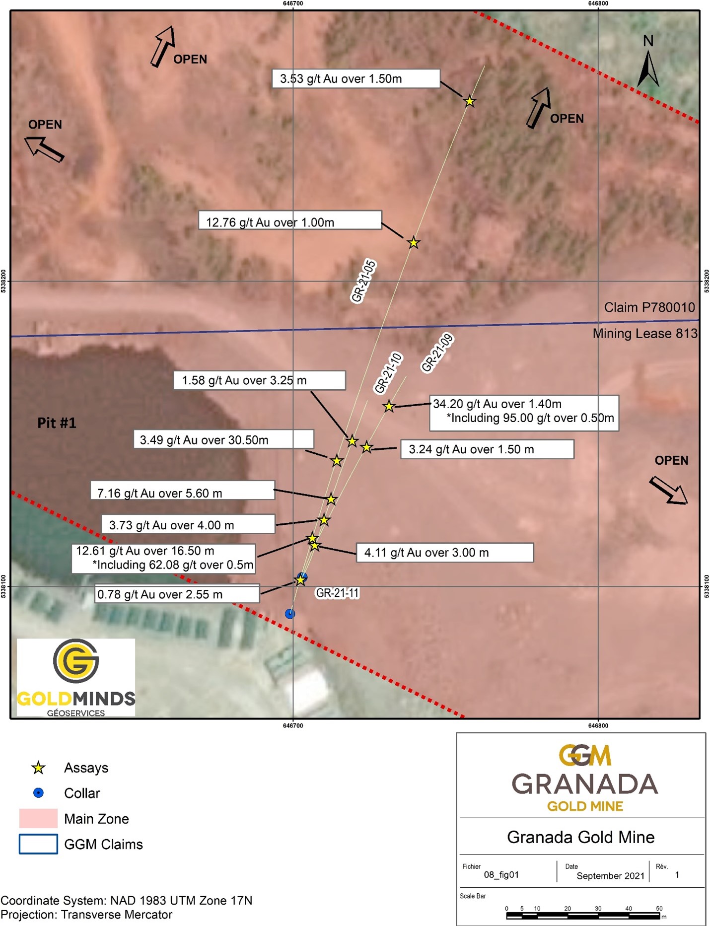 - Previously released results from GR-21-05 graded 3.49 g/t over 30.50m (including 66.54 g/t over 0.50m (Press release June 21, 2021), and 12.61 g/t over 16.50m (including 62.06 g/t over 0.50m), with new results grading 12.76 g/t over 1.00m, and 3.53 g/t over 1.50m.