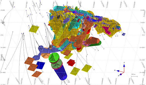 Figure 1 Isometric View Looking SSE Showing the Drill Holes, and the Thin, Rich Veins Model (107 wireframes)