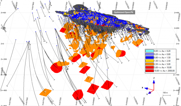The previous mineral resource estimate published in 2021 had reported a measured and indicated estimates for open pit of 5,113,000 tonnes grading 2.06 g/t Au containing 339,0n00 oz Au, and underground of 844,000 tonnes grading 4.03 g/t containing 109,000 oz Au (amounting to a combined open pit and underground contained 449,000 oz Au). The 2021 estimate also reported inferred resources for open pit of 34,000 tonnes grading 11.29 g/t Au containing 12,000 oz, and underground of 1,244,000 tonnes grading 6.33 g/t Au containing 253,000 oz Au (amounting to a combined open pit and underground contained 266,000 oz Au). Compared to the 2021 amounts of contained gold, the new in-pit and underground resource estimates represent a 21 percent increase for measured and indicated (543,000 oz Au in 2022 vs 449,000 oz Au in 2021) and a 71 percent increase for inferred (456,000 oz Au in 2022 vs 266,000 oz Au in 2021).
