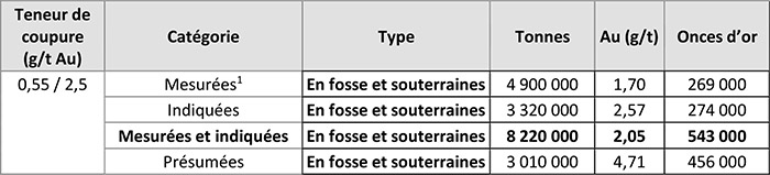 Tableau 1 : Estimation des ressources minérales montrant les tonnes, les teneurs moyennes et les onces d’or