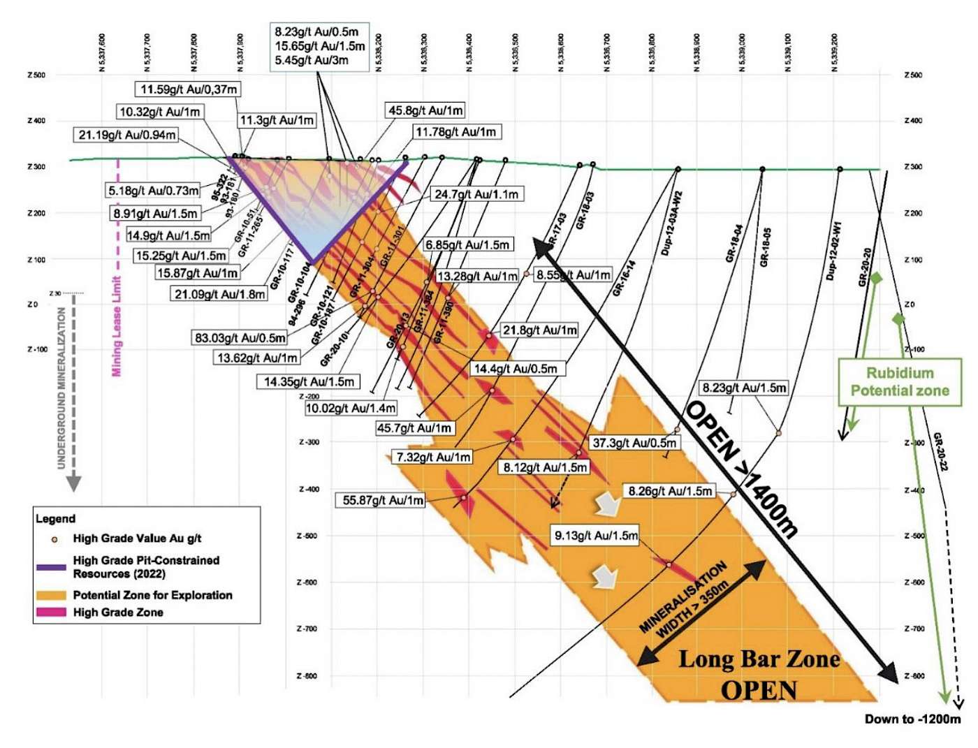 Montrant la fosse, les intersections à haute teneur et les zones favorables pour l’exploration future