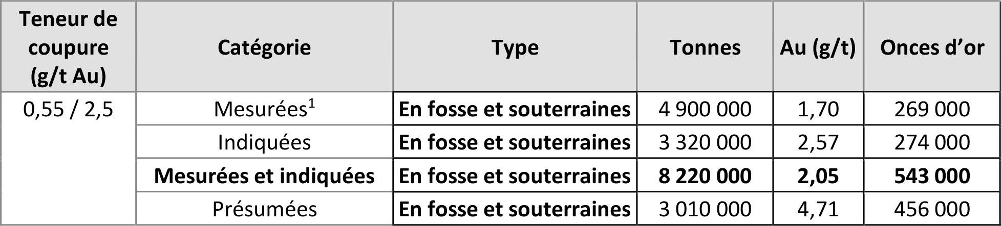 Tableau 1 : Estimation des ressources minérales montrant les tonnes, les teneurs moyennes et les onces d’or